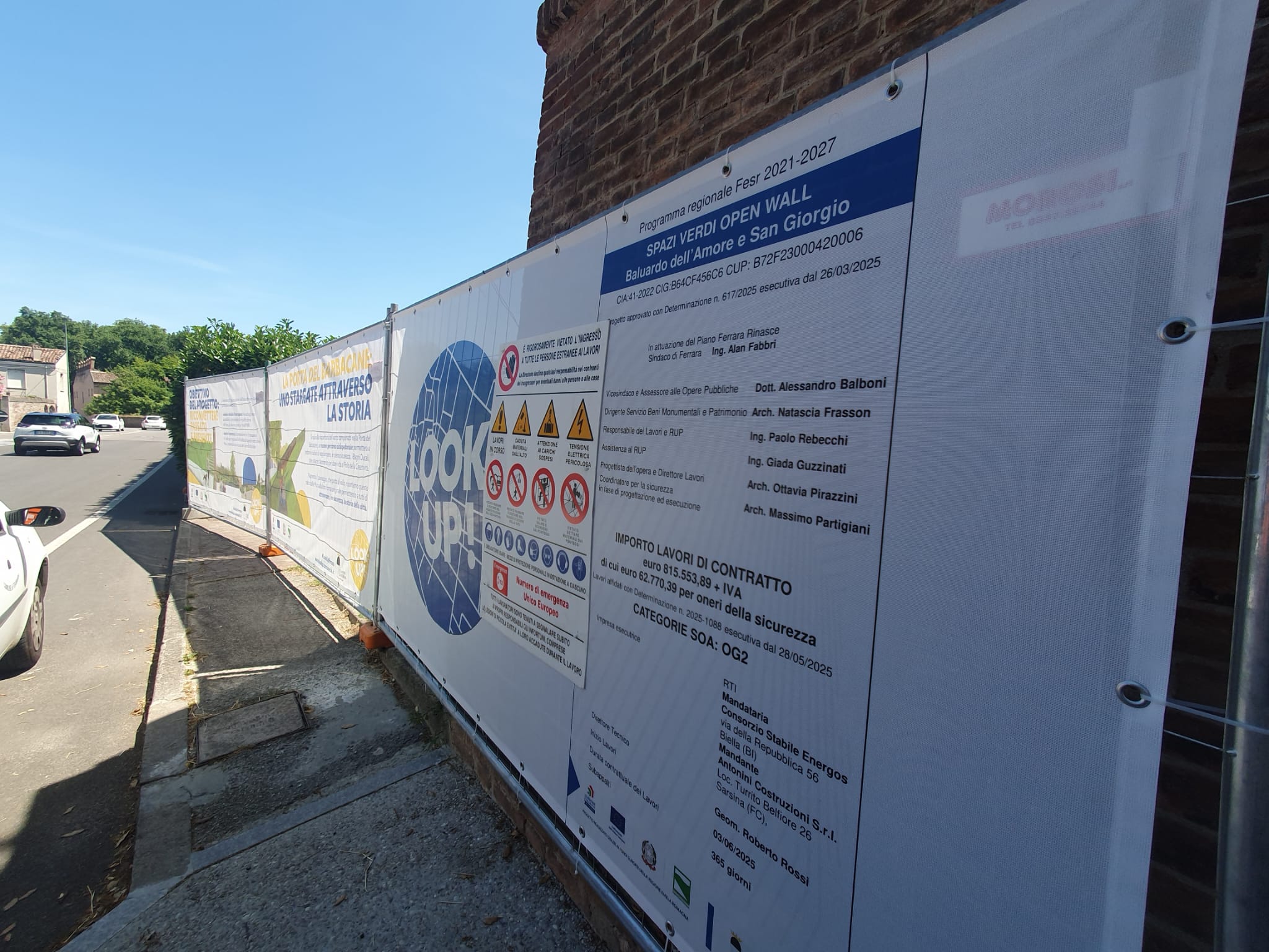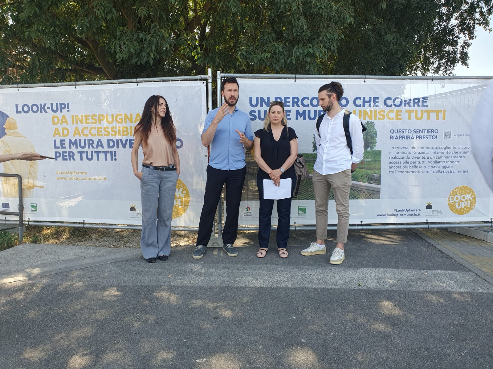 Il progetto Look Up! Ferrara prende forma: dopo l'avvio dei lavori al Museo Civico di Storia Naturale, venerdì 27 giugno 2025 alle 11:30 si terrà l'incontro sul Baluardo di San Lorenzo (via Baluardi, all'inizio del camminamento sopra le Mura - vedi foto) per la presentazione dell'avvio dei lavori per il Camminamento Accessibile sulle Mura di via Baluardi e della riqualificazione dei baluardi dell'Amore e di San Giorgio. Tutti questi interventi fanno parte dei progetti della strategia Atuss-Agenda trasformativa urbana per lo sviluppo sostenibile di Ferrara, finanziata con oltre 8,5 milioni di fondi europei, e sono accompagnati dalla strategia comunicativa dei "Teli Parlanti".